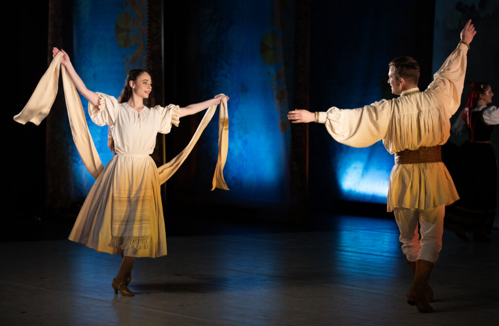 A Duna balladái – Táncok és imák a Duna mentén című előadás jelenete. Kék népviseletet viselő táncosnők lassú, emelkedett mozdulatokat végeznek a színpadon.